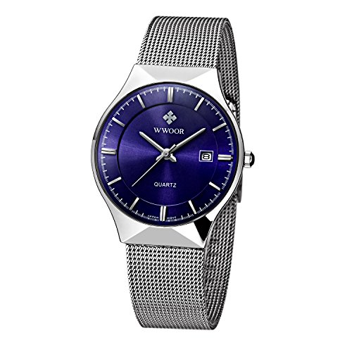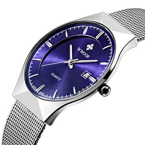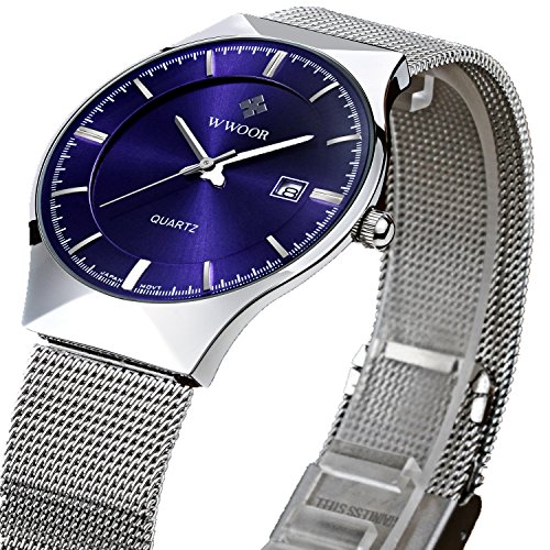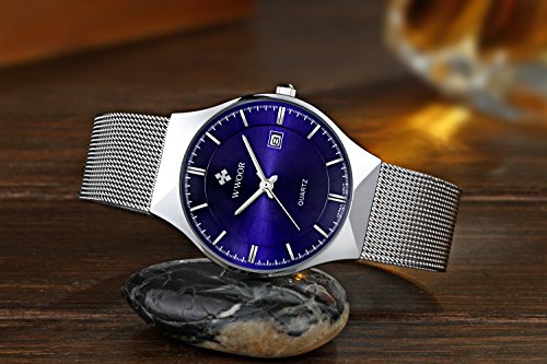WWOOR 腕時計 ラウンドスリム 薄型 ビジネス クォーツ時計 防水 男性 青色