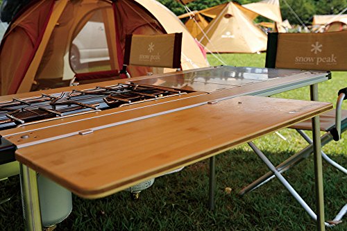 スノーピークの人気ユニットテーブルであるアイアングリルテーブルのフレーム部分にスライドさせて取り付けて使う竹製のオプションテーブルになります。