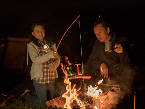 先端にソーセージやマシュマロなどをつけて、釣竿のように焚き火へとかざして食材を自分好みの焼き加減にして食べられる口コミでも評判の良いキャンプアイテムです。