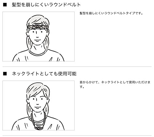 髪型を崩しにくいラウンドベルトタイプで、頭へと装着するだけでなく、首元から下げてネックライトとしても活躍してくれます。ヘッドライトの角度を調節する事ができますので、キャンプシーンでの夜間作業や夜間移動時も手元や足元をしっかりと照らす事ができて便利です。