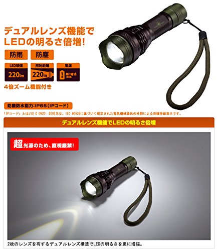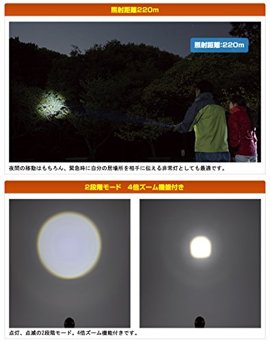 防塵防水仕様のハンディライトになりますので、悪天候時のアウトドアシーンや埃の舞う環境下でも安心して活用する事が出来ます。照射距離220mと遠方までしっかりと明かりを照らす事が出来ますので、緊急時に自分の存在を知らせる非常灯としても活躍してくれます。