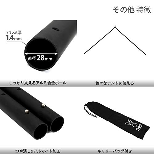 カラーバリエーションが豊富なタープ用のポールです。つや消しでアルマイト加工が施されているアルミ合金でできていて、重さは990グラムと軽量ですが、最大250センチにもなります。収納する時は5分割でき58センチ程度に収まるため持ち運びしやすく直径28ミリ、連結させやすいボタン式、50センチごとに高さの調整が可能と使い勝手もよく大型タープから小型のタープまで使えます。