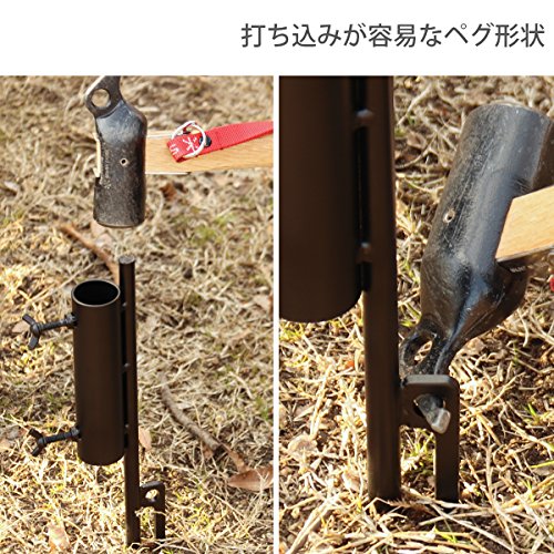 スタンド本体となるペグを地面に対して垂直にしっかり打ち込んでいき、付属の専用のポールをスタンドに通してから側面のネジを締めポールを固定します。ポールの好きな位置に付属の小型のランタンハンガーを取り付けてランタンを吊るすだけです。ペグの上部にある穴を利用すると撤収するときも簡単に抜けます。なお吊り下げできるランタンの重さは800グラムまでです。