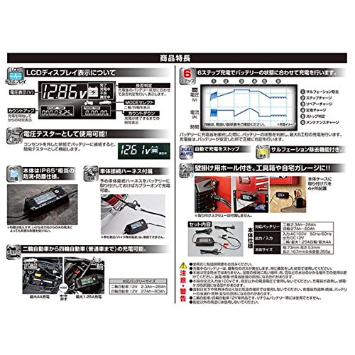 自動停止機能やサルフェーション除去機能の付いた便利なバッテリー充電器です。ディスプレイでバッテリーの状態を確認でき、IP65相当の防塵・防滴機能があるので、車庫だけでなく外での使用も可能です。