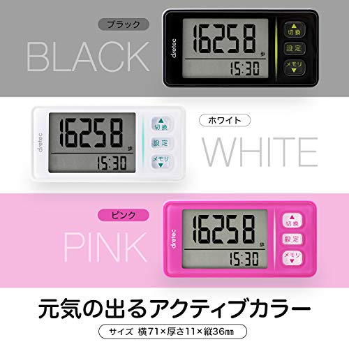 出典: https://www.amazon.co.jp/DRETEC-%E6%B6%88%E8%B2%BB%E3%82%AB%E3%83%AD%E3%83%AA%E3%83%BC-%E3%82%A8%E3%82%AF%E3%82%B5%E3%82%B5%E3%82%A4%E3%82%BA%E8%A1%A8%E7%A4%BA-%E3%82%B9%E3%83%88%E3%83%A9%E3%83%83%E3%83%97%E4%BB%98%E3%81%8D-H-236PK/dp/B0753JLWK1/ref=sr_1_11?ie=UTF8&qid=1546390225&sr=8-11&keywords=%E6%AD%A9%E6%95%B0%E8%A8%88%E3%80%803D前面にボタンが3つだけ付いていて、操作方法もシンプルな歩数計になりますので年代問わず誰にでも使いやすいです。ダイエットや健康の為の運動など、様々な使用用途で活用できるメリットが豊富にある歩数計になります。選び方ではブラック、ホワイト、ピンクの計3種類から比較して選択できます。