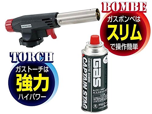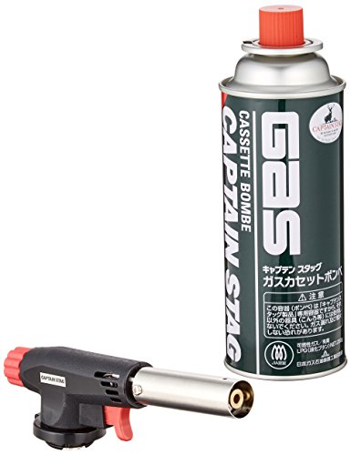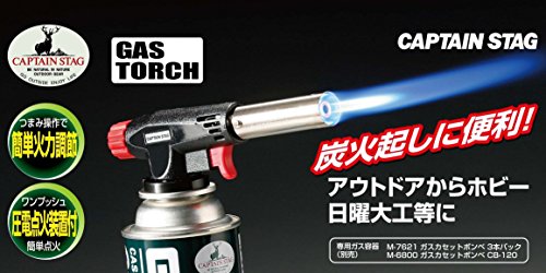 キャプテンスタッグの一番シンプルで標準的なガストーチです。逆さまにして使用できないのでキャンプやアウトドアで使うより、家庭などで炙り料理やスモークウッドの着火などに向きます。使い方はCB缶を下に装着し、ガストーチの背面のつまみを回してガスを少量出してからトリガーを引くだけです。トリガーを引くことに寄って着火できる圧電点火方式となっています。火力調整はつまみを回すことで可能です。