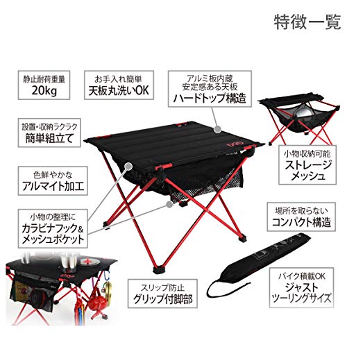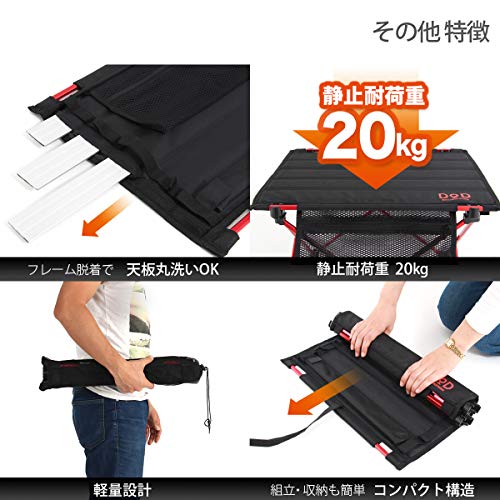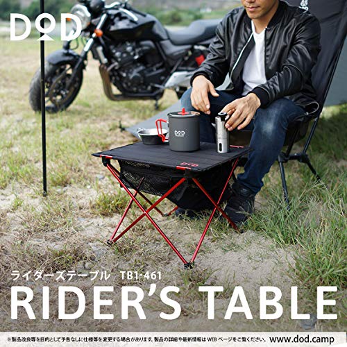 出典: https://www.amazon.co.jp/DOD-%E3%83%87%E3%82%A3%E3%83%BC%E3%82%AA%E3%83%BC%E3%83%87%E3%82%A3%E3%83%BC-%E3%83%A9%E3%82%A4%E3%83%80%E3%83%BC%E3%82%BA%E3%83%86%E3%83%BC%E3%83%96%E3%83%AB-%E3%80%90%E3%83%84%E3%83%BC%E3%83%AA%E3%83%B3%E3%82%B0%E4%BB%95%E6%A7%98%E3%80%91-TB1-461/dp/B01FA8ADZI/ref=sr_1_1?ie=UTF8&qid=1546863022&sr=8-1&keywords=DOD%E3%80%80%E3%83%A9%E3%82%A4%E3%83%80%E3%83%BC%E3%82%BA%E3%83%86%E3%83%BC%E3%83%96%E3%83%ABアルマイト加工の赤いフレームを広げ、ストレージメッシュや蛇腹の天板を取り付けて使います。高強度ファブリックで頑丈な天板を含め、黒と赤のカラーがかっこよさを引き立てます。DODのテーブルの中でも上位の小型軽量なことで、ライダーではない女性キャンパーも手に取ってみたいアクセサリーです。