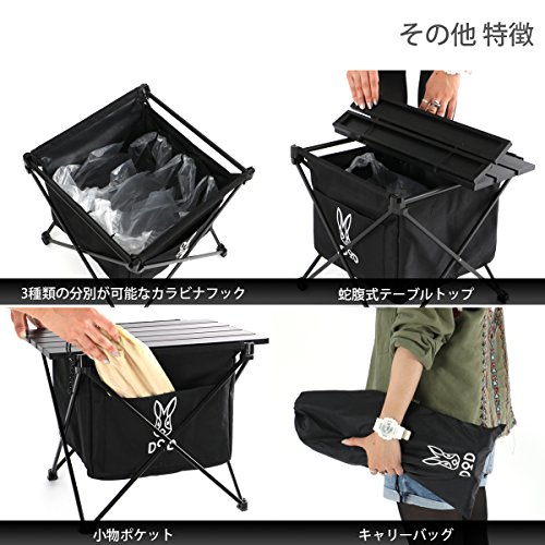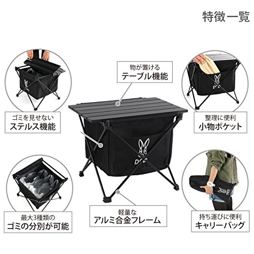 出典: https://www.amazon.co.jp/DOD-%E3%83%87%E3%82%A3%E3%83%BC%E3%82%AA%E3%83%BC%E3%83%87%E3%82%A3%E3%83%BC-%E3%82%B9%E3%83%86%E3%83%AB%E3%82%B9%E3%82%A8%E3%83%83%E3%82%AF%E3%82%B9%E3%83%9F%E3%83%8B-%E3%82%BD%E3%83%AD%E3%82%AD%E3%83%A3%E3%83%B3%E3%83%97%E7%94%A8%E3%82%B5%E3%82%A4%E3%82%BA-GM1-598-BK/dp/B07CZ2NCW9/ref=sr_1_2?ie=UTF8&qid=1546861880&sr=8-2&keywords=DOD%E3%80%80%E3%82%B9%E3%83%86%E3%83%AB%E3%82%B9%E3%82%A8%E3%83%83%E3%82%AF%E3%82%B9さっと拭き取るだけで汚れもさっぱり落とせる生地を採用しています。内部はゴミ分別がしやすいと評判な、複数のカラビナフックが付いています。蛇腹式のテーブル部は、小さくても耐荷重30キロとかなりの強度。DODのウサギマークがついた外側の収納ポケットが、使いやすさを向上させています。
