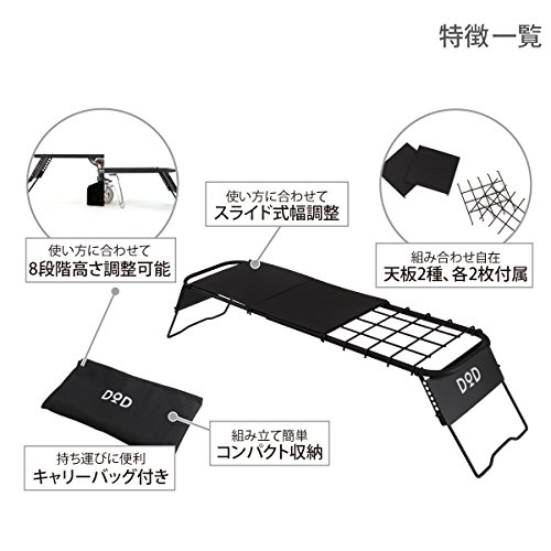 出典: https://www.amazon.co.jp/DOD-%E3%83%87%E3%82%A3%E3%83%BC%E3%82%AA%E3%83%BC%E3%83%87%E3%82%A3%E3%83%BC-%E3%82%B9%E3%83%88%E3%83%AC%E3%83%BC%E3%82%B8%E3%82%A2%E3%82%A6%E3%83%88%E3%83%89%E3%82%A2%E3%83%86%E3%83%BC%E3%83%96%E3%83%AB-%E3%83%86%E3%83%B3%E3%83%88%E3%82%B5%E3%82%A4%E3%83%88%E3%81%8C%E3%81%99%E3%81%A3%E3%81%8D%E3%82%8A-TB5-110T/dp/B01H1WNXWQ/ref=sr_1_1?ie=UTF8&qid=1546862627&sr=8-1&keywords=DOD%E3%80%80%E3%82%B9%E3%83%88%E3%83%AC%E3%83%BC%E3%82%B8%E3%82%A2%E3%82%A6%E3%83%88%E3%83%89%E3%82%A2%E3%83%86%E3%83%BC%E3%83%96%E3%83%AB採用されたポールは4段階の高さ調節もでき、アウトドアの場所にしっくり対応します。天板は意外と広めで、調理台にしたり食事のテーブルにしたりと使い方は色々。折り畳むとトートバッグのように小さくなって持ち運びも軽快です。DODのテーブルでは、片付けたい派から評判を得ている一品です。