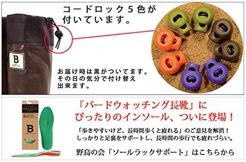 ゴム長靴専門メーカー等と協力し、干潟やぬかるみでも行動しやすく、バードウォッチングに適したラバーブーツになっています。一般的な長靴よりもはるかに動きやすい上、デザインも良いので、ガーデニングや野外キャンプの際、雨の日の通勤などにも活躍します。またくるくると折りたためるのでコンパクトに収納できるため、野外フェスなどで活躍します。