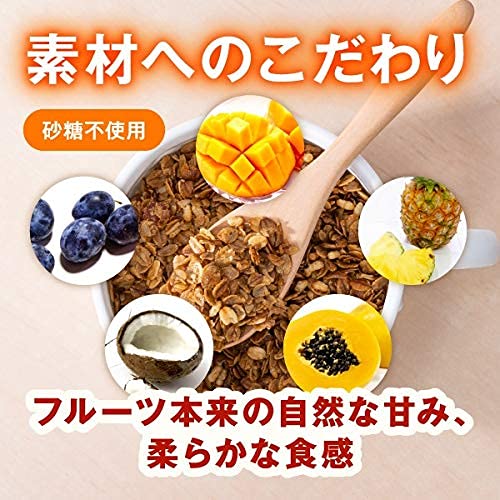 フルーツの具の種類が多いだけでなく、使われている穀物の種類も、大麦、小麦、オーツ麦などの麦類に加えて、大豆や青大豆に黒大豆などの豆類も多く含まれているため、ビタミンや鉄分やカリウムなどさまざまな栄養素が充実しています。