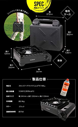 風にも強く、重たいダッチオーブンの使用可能な人気のカセットコンロタフまるです。その名の通り、耐荷重が20kg、二重構造の風防で強風にも強く、屋外での使用でも全く問題ありません。さらに持ち運びに便利な、キャリングケースが付いています。ブラックボディもおしゃれです。唯一の弱点はコンパクトさ、小型ではないところでしょうか。とはいえ屋外で使え、火力も強く、ダッチオーブンも可能、携帯性にも優れているカセットコンロはこのタフまるだけです。もちろん家庭用でも使え、万が一の防災用に持っていても損はない、おすすめのカセットコンロです。