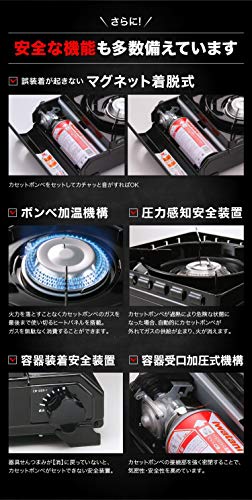 超小型でコンパクト、携帯性に優れているので、ソロキャンプやツーリングキャンプにぴったりなカセットコンロです。火力も強く、ソロキャンプならこのカセットコンロで充分。五徳部分が風防代わりになるので風にも強く、キャンプなどの屋外での使用はもちろん、ご家庭でも一人用小鍋を使う際には、丁度良いサイズです。ただし安全装置がないので、長時間の使用は避けるようにしましょう。