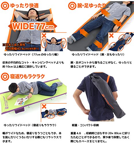 横幅が77cmもある広めのキャンピングベッド(コット)でリーズナブルな価格です。ワイドになったため4.3kgと重たいですが、地面からの高さも19cmとたくなっていて快適に過ごすことができます。設営方法はヘリノックスと同じで同社のバッグインベッドのように簡単に組み立てることができます。生地はポリエステルにポリ塩化ビニルをコーティングして耐久性を増していたり、小物を入れる小さなポケットがコットに付いています。