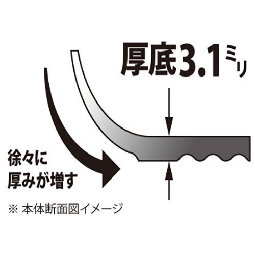 | 材質 | 本体:アルミニウム合金(底厚3.7mm)、 本体内面:ふっ素樹脂塗膜加工(テフロンプラチナプラス) 、本体外面:ふっ素樹脂塗膜加工 、ハンドル:フェノール樹脂 |