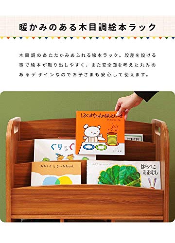 木目柄の優しいナチュラルな風合いで、段差が設けられている事で、子供も簡単に本を取り出しやすいです。更に表紙を見せるように本を立てかけられるメリットもありますので、見たい本を素早く出す事も出来ます。