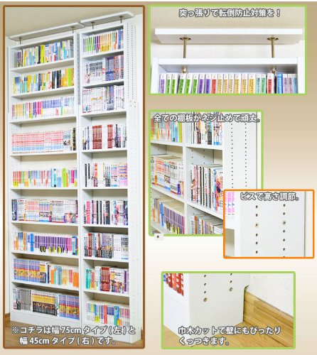 つっぱり機能が付いていますので、しっかりと天井部分に固定して壁面に設置できる為、本棚の転倒も防ぐ事が可能です。棚板の高さは2.5cmごとに調節できる為、本の高さに合わせて変えられます。