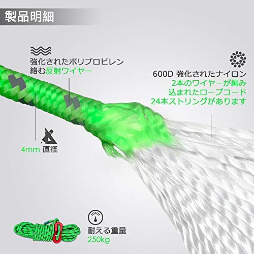 蓄光素材のように自らが光るわけではないですが、反射材が織り込まれているのでランタンや懐中電灯などで照らすと反射し目立つのでロープでつまずく事故が少なくなります。最初から自在金具がついているので通す手間も省けおすすめです。