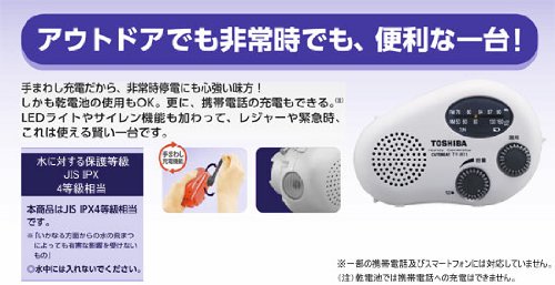 手動充電を採用している防水ラジオになりますので、登山やハイキング、また緊急災害時にも活躍します。また必要に応じて乾電池で使う事もでき、携帯電話の充電も出来て便利です。