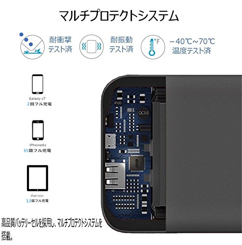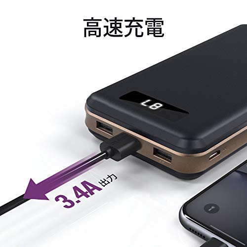 このモバイルバッテリーはA級リチウムイオン電池を採用していて、容量は最強クラスの30000mAhになっています。iPhone Xだと7回、galaxy S8だと6.5回充電できる上に販売価格は安いため、非常に人気が高いです。USBポートは3つ用意されているため、一度に3台のデバイスを接続する事が可能です。他のメーカーのモバイルバッテリーと比較すると便利で、スマホを数台持っている人には特におすすめです。