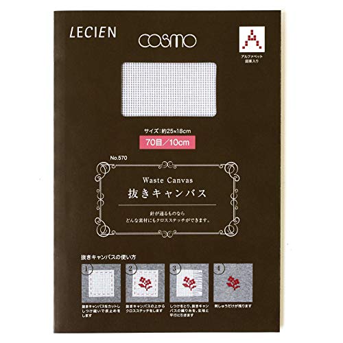 専用布以外の布を使うときに用いるものです。使い終わった後は糸を抜いてしまうので「抜きキャンバス」といいます。これがあるとどんな布にもクロスステッチをすることができてとても便利です。「70目」、「10㎝」とは、10㎝あたり70目×70目という意味です。初心者はもっと大きい目のものを選んでまずは刺し方を覚えたほうがいいかもしれません。