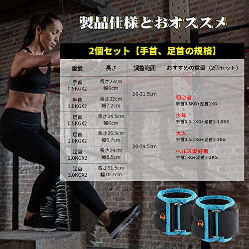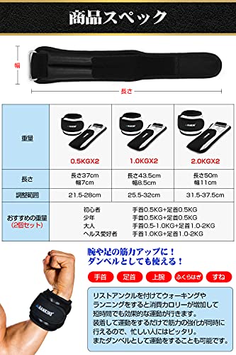 適用サイズ:0.5kg(片側)/足首約0~25cm、1.0kg/足首約0~28cm、2.0kg/足首約0~31cm