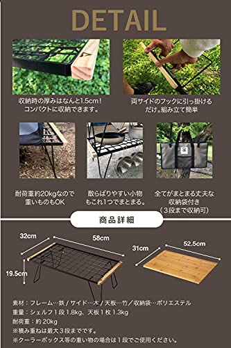 天板に竹素材を使った人気のキャンプ用収納シェルフになります。フレームには軽量なアルミパイプを使っていますので、大きさの割に全体的な重さは5.8kgと軽く、キャンプへと持ち運びしやすい収納棚です。