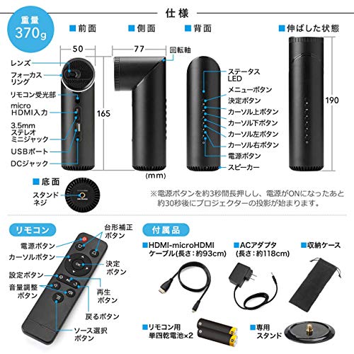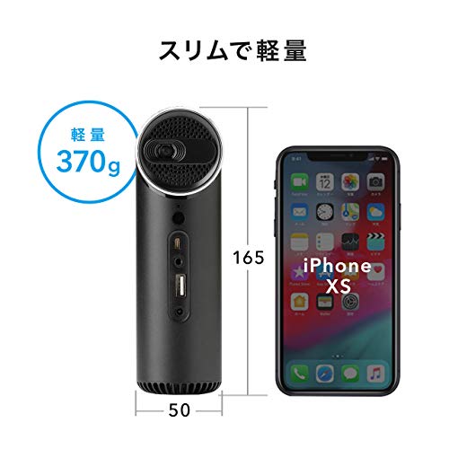 こモバイルプロジェクターは50mm×50mm×190mmのサイズで、重量は370gです。コンパクトなボディな上に色はブラックとかっこよく、おしゃれです。販売価格も安いため、特に若い男性から高い人気を得ています。