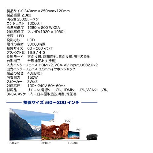このキャンプ向けモバイルプロジェクターは340mm×250mm×120mmのサイズで、重量は2.3kgです。3500ルーメンの明るさを持っており、屋外と室内に関わらず、非常に見やすく、人気が高いです。