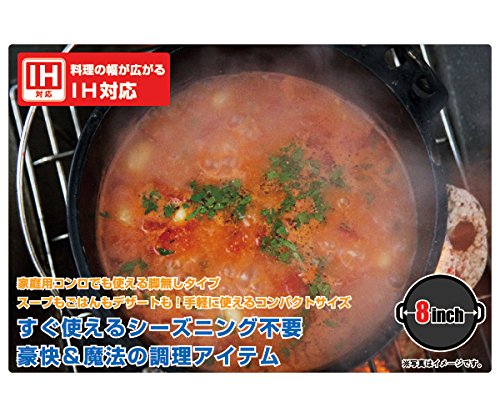 このダッチオーブンのサイズのサイズは直径25.8cm×13.5cmで、重量は4.9kgです。本体とフタには鉄、つるにはスチールの素材が採用されています。シーズニングをしなくても良いため、購入してからすぐに使えて、他のメーカーのダッチオーブン・鍋と比較すると非常に便利です。特にフタはフライパンとしても活用できるようになっていて、バーベキューなどをする際の作る料理の幅もより広がります。