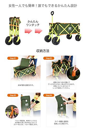 怒涛の1位を獲得している人気の品は、WAQから出ているキャンプワゴンです。明るいオレンジとライムグリーンに、深みあるグリーンというアウトドア仕様の外観が評判です。カートは見るからに安定感ばつぐんな、大サイズのタイヤが目を引きます。