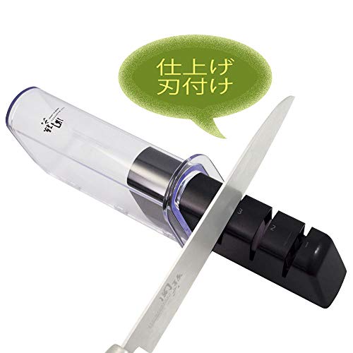 粗刃つけでの研ぎが終わったら、刃角落としの差し込みに入れて研ぎます。研ぎ方と回数は先程と同じ。最後に仕上げの差し込みに入れても、5回研いで完成です。砥石と比較すると、包丁を動かす回数も、気をつける点も少ないですね。