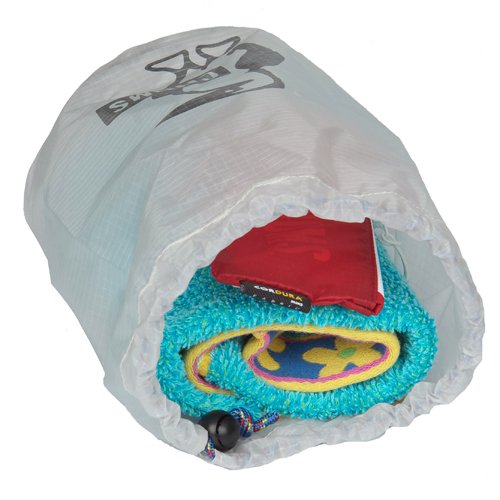 素材に使っているのは軽量で、生地が完全に破けないリップストップナイロン生地を使っています。タオルなどの小物を出し入れしやすい巾着タイプのスタッフサックで、使い方が簡単です。