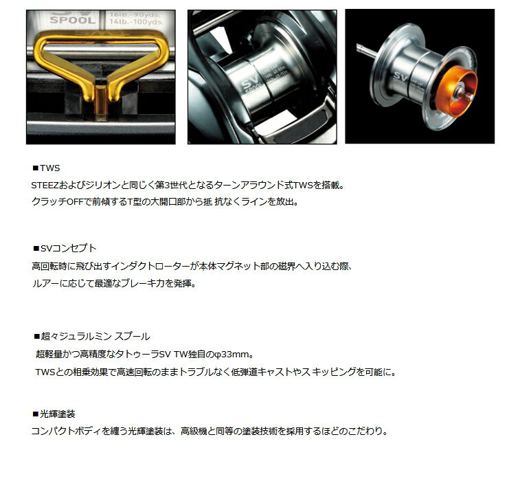 ダイワのベイトリールのタックルの中では、タトゥーラがおすすめです。しっかりとドラグ力もあり、16lbのラインも80m巻くことができるのでスイムジグをするためにはちょうどよいタックルバランスが取れると思います。ハイギアもしくは、ノーマルギアのモデルを選ぶと使いやすいと思います。しっかりと遠投もできるのでオカッパリアングラーにもおすすめです。