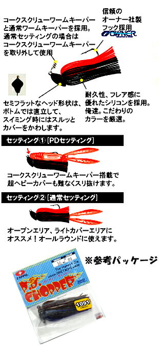 PDチョッパーにトレーラーとしてアンモナイトシャッドをセッティングしたものが今定番となっています。神セッティングともいわれているくらい釣れる有名なセッティングとなっていますね。アンモナイトシャッドのパワーのある動きとPDチョッパーの特徴的なヘッドの形状により神の動きをしています。スイムジグ初心者はまずはこのセッティングから始めてみるのがいいと思います。