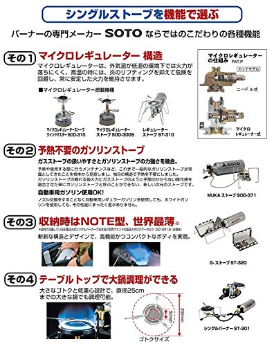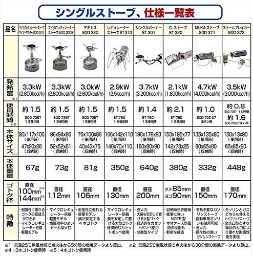 出典: https://www.amazon.co.jp/SOTO-%E3%82%BD%E3%83%88-%E3%82%B7%E3%83%B3%E3%82%B0%E3%83%AB%E3%83%90%E3%83%BC%E3%83%8A%E3%83%BC-ST-301-073019%E3%80%90%E3%82%B7%E3%83%B3%E3%82%B0%E3%83%AB%E3%82%B3%E3%83%B3%E3%83%AD%E3%80%91%E3%80%90%E3%82%B9%E3%83%88%E3%83%BC%E3%83%96%E3%80%91/dp/B001CBVCGC/ref=sr_1_1?ie=UTF8&qid=1553518879&sr=8-1&keywords=SOTO%E3%80%80ST-3012019年4月頃に発売予定の新作のシングルバーナーです。分離型と呼ばれるバーナー部分とガス缶が離れている種類なので五徳が大きく、放射熱を気にしなくてもいいのでシングルバーナーでもダッチオーブンが使えます。SOTOには新製品とは別に分離型のバーナーがありますが、こちらは風に弱く、寒い環境でも火力が安定するマイクロレギュレーターが搭載されていないため新型のほうが圧倒的に良くなっています。
