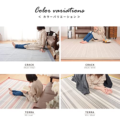 見た目にも涼しい爽やかなボーダーのカーペットは、「しじら織り」という技法で織られた布で作られています。しじら織は、布の表面がでこぼこになるように織られたという特徴があり、肌にぴったり張り付きにくくなることで、触れても涼しく感じます。サイズは2畳と3畳と4畳があります。