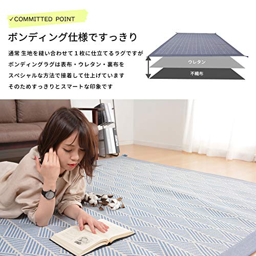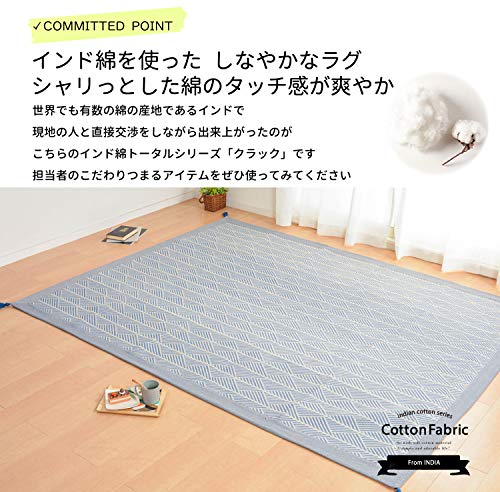 インド綿を使用しており、コットンの肌触りが優しいラグマットは、夏の嫌な汗や湿気を吸収してくれます。裏側にウレタンクッションと不織布を合わせていますので、布一枚よりもクッション性があり、座っても体が痛くなりにくいです。絨毯とは違い毛足が短いので、掃除機やコロコロでのお手入れが簡単にできます。