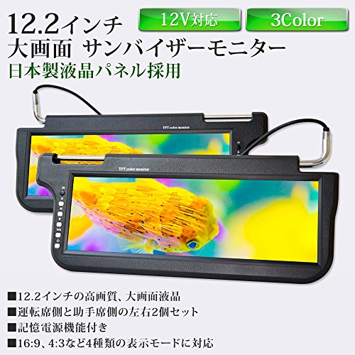 運転席側と助手席側の元からあるサンバイザーへと取り付けて使う事のできる左右2個セットのサンバイザーモニターになります。日本製の号画質な12.2インチ大型液晶パネルを採用しています。