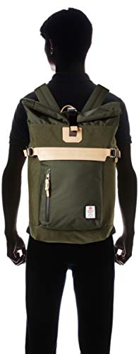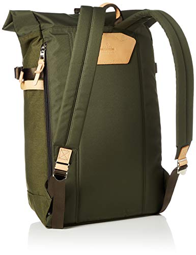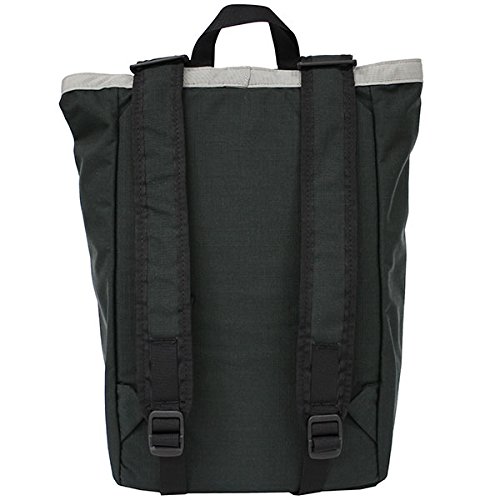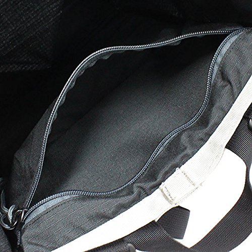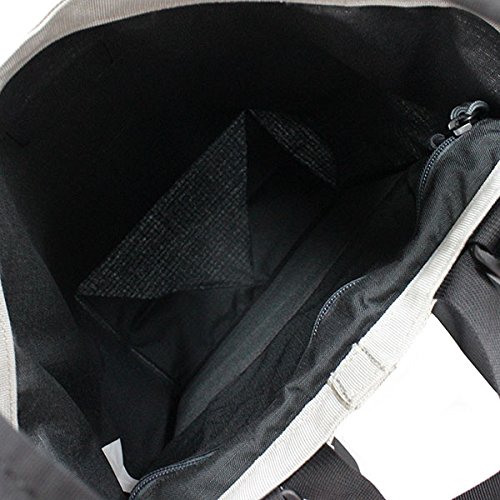 上部にある収納部分はベルクロ留めで口を閉じて、ロールしてバックルでまとられる形状となっている為、荷物量に合わせて容量を調節する事も可能となっています。またサイドストラップを用いればマチ幅を絞る事もできてとても便利です。