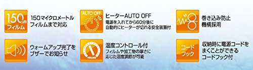 こちらはA3サイズまで対応しており、業務用としても家庭用としても使っていただけるタイプです。4本ローラータイプなので、2本ローラーのものよりもヨレの心配が少なく加工できます。フィルム150㎛の厚さまで対応しており、最大厚みは0.6mmまで可能。電源を入れてから60分で自動的に電源がオフになるので、つけっぱなしの心配もありません。