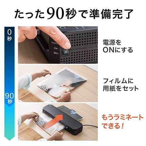 こちらの製品は、A4サイズ対応のラミネーターです。待機時間は約5分。4本ローラーでしわやヨレも少なく仕上がります。フィルムのまき込み防止機能が付いており、温度もダイヤル式で調節可能。フィルムの最大厚さは150㎛で、最大厚みは0.6mmまでOK。A4サイズであれば、約45秒で仕上がります。