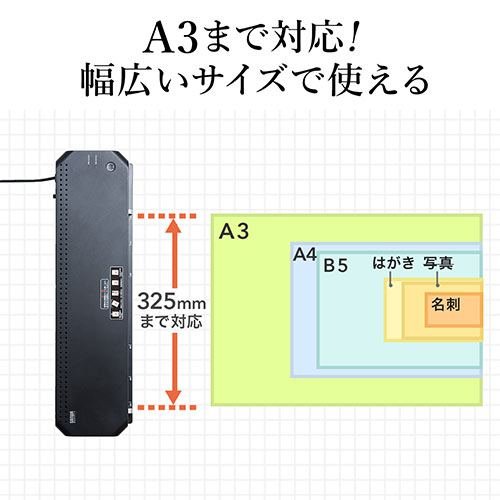 A3もラミネートできて、便利です。すぐ立ち上がり、時間もかかりません。