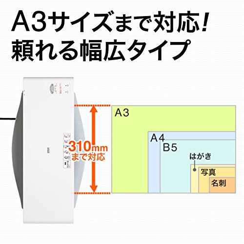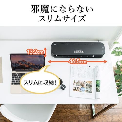 2019年おすすめラミネーターランキング10位はサンワダイレクトメーカーのラミネーターです。こちらのラミネーターは、A3サイズまで対応しており、四角くシンプルなデザインが特徴です。4本ローラーなのでしわも少なく加工でき、逆回転機能付きでフィルム詰まりにも安心できるラミネーターです。