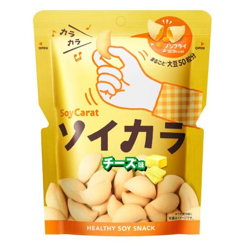 太らないカロリーオフのお菓子は「ソイカラ」です。大豆50粒分のタンパク質や大豆イソフラボンの栄養価が含まれていて、美味しく丸ごと大豆を味わえるお菓子です。中に大豆が入っていて振るとカラカラと音がして、ノンフライで粉末調味料が付いていないので、手を汚さず食べられます。携帯にも便利な食べきりサイズです。