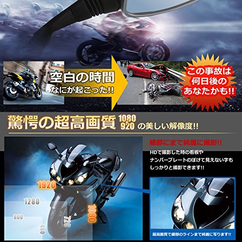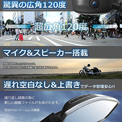 汎用性の高いミラータイプの、バイク用ドライブレコーダーです。ダブルカメラの採用で120度の広い視野を実現、死角のない映像で事故の証拠をしっかりと記録します。2.7インチの高解像度モニターでバックミラーに映像が映し出されるので、ライダーの視線の移動も少なく安全です。マイク内蔵で音声も記録でき、人感センサー搭載なので、事故だけでなく不審者からもバイクを守ってくれます。