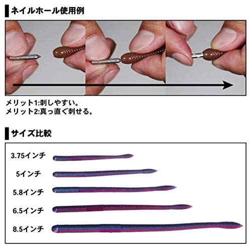 定番のストレートワームです。ゲイリーヤマモトとのコラボアイテム「ネコストレート」とは異なるマテリアルが採用されており、こちらは反発力を重視したタイプのセッティング。ブルっとした動きでバスを誘います。適切なネイルシンカーセットのためのネイルホール採用で、焦るシチュエーションでも真っすぐセット可能!いつでも誰でも性能を引き出せる、使い手を選びにくいワームに仕上がっています。
