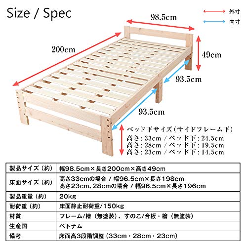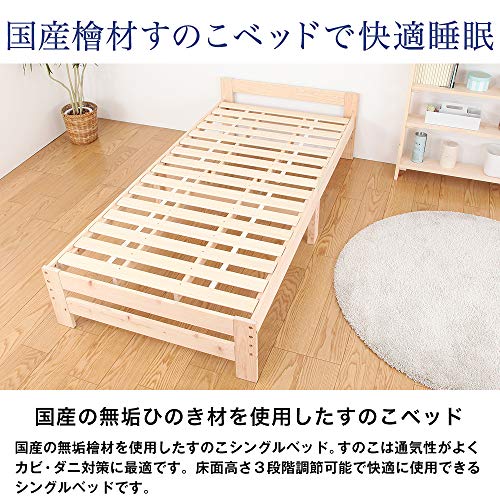 (JAJAN) 3段階高さ調節できる ひのきフレームは、マットレスなしで耐荷重が150kgです。安定性が抜群で、強度試験にクリアしたものだけを出荷しています。