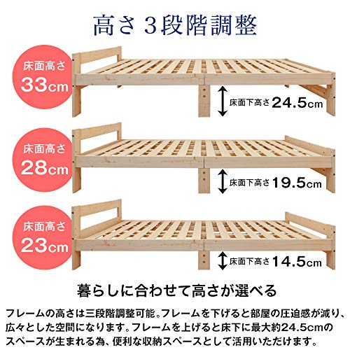 (JAJAN) 3段階高さ調節できる ひのきフレームは、3段階の高さ調節ができます。33cm、28cm、23cmなので、部屋の雰囲気や収納量、お好みに合わせて調節してください。
