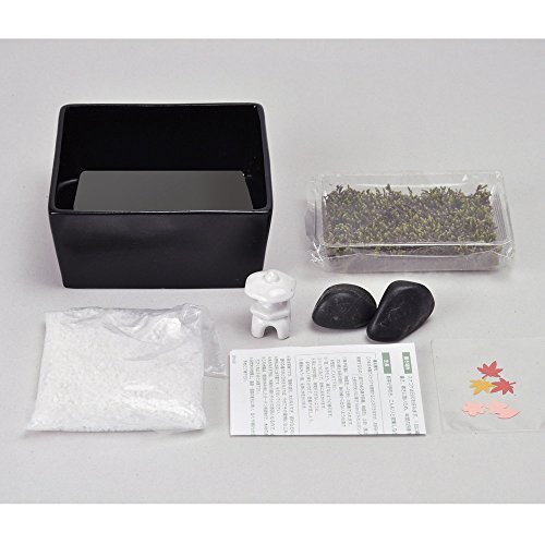 器(陶器製)、スナゴケ、化粧砂、黒石、ミニ灯籠、さくら・もみじ型チップ、底スポンジがセットになっています。植え方は器の中に苔を配置し、白い化粧砂を敷いて霧吹きで水やりするだけなので簡単です。附属のミニ灯籠や黒石でアレンジし、さくらまたはもみじ型チップで季節感を演出しましょう。自由な発想で、あなただけの庭園を作りあげてください。
